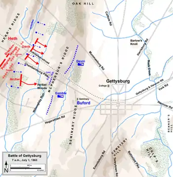 Утром 1 июля появились две бригады противника (Хета и Арчера). Передовые пикеты Бьюфорда отступили к Герр-Ридж, присоединились ко второй линии пикетов и этот отряд, теперь численностью около 500 человек, открыл огонь по наступающему противнику и сумел продержаться примерно 45 минут. Когда южанам удалось взять Герр-Ридж, им пришлось задержаться для наведения порядка в своих рядах. Примерно в 09:15 они двинулись дальше — через долину ручья Уиллоуби на хребет МакФерсона. Бригада Гэмбла в это время заняла позиции слева от Чамберсбергской дороги, бригада Дэвина — справа. Бьюфорд наблюдал за происходящим с Семинарского хребта, поднявшись на башню здания находившейся здесь лютеранской семинарии.