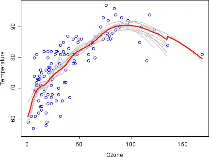 Связь между температурой и озоном в этом наборе данных, очевидно, нелинейна. Чтобы описать эту связь, использовались сглаживатели LOESS (с полосой пропускания 0,5). Вместо построения единого сглаживателя из всего набора данных извлечено 100 выборок бутстрэпов данных. Каждая выборка отличается от исходного набора данных, но они, всё же, совпадают по распределению и дисперсии. Для каждой бутстрэп-выборки применялся сглаживатель LOESS. Затем сделано предсказание по данным на основе этих 100 сглаживаний. Первые 10 сглаживаний показаны серыми линиями на рисунке ниже. Линии, как видно, очень волнисты и страдают переподгонкой данных – результат полосы слишком мал.