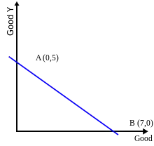 - В случае двух благ бюджетное ограничение пересекает ось в точке , а ось в точке .
