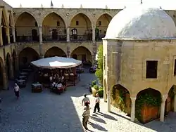 Четыре двухэтажных здания, чья община длина фасадов составляет около 50 метров, образуют квадратный комплекс с колоннадой во внутреннем дворе и расположенными над ним верандами. В центре открытого внутреннего двора расположена мечеть с фонтаном для предшествующих молитвам омовений. В нём также располагаются кафе и магазины сувениров.[2]
