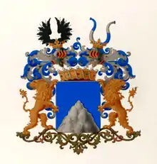 Описание герба: Выдержка из Общего гербовника В лазоревом щите серебряная скала. Щит увенчан баронскою короною и двумя коронованными шлемами. Нашлемники: первый, два черных орлиных крыла, второй, два буйволовых рога, пересеченные первый — лазурью, с серебром, второй — серебром и лазурью. Намет лазоревый, с серебром. Щит держат два золотых льва, с обращенными головами и червлеными глазами и языками. |