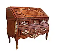 Изначально название телячьей кожи, которой обтягивали выдвижную доску конторки, затем — особый тип мебели, появившийся во Франции в середине XVII века: разновидность письменного стола, под откидывающейся крышкой которого находились два выдвижных ящика. Как правило, откидывающуюся или выдвигающуюся доску для письма обтягивали тонкой кожей. Дорогие бюро в качестве дворцовой, аристократической мебели, изготавливали из различных пород красного или чёрного (эбенового) дерева, декорировали в технике маркетри или инкрустацией перламутром, дополняли золочёными бронзовыми накладками[3]. Существует несколько версий происхождения такого типа мебели, самая вероятная из них — от шкатулок с наклонными крышками. В таких шкатулках хранили не только украшения, но и письма. В дальнейшем хранение писем, драгоценностей и секретных документов стало основной функцией секретеров.