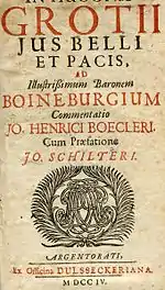 - In Hugonis Grotii Ius Belli Et Pacis, Ad Illustrißimum Baronem Boineburgium Commentatio Jo. Henrici Boecleri. Straßburg 1663/1664