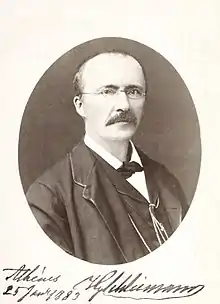 Генрих Шлиман сознательно выстраивал рекламу своей деятельности и проводил последовательную политику её героизации. Открытие «Клада Приама» в 1873 году сделалось мировой сенсацией, но не привело к серьёзному восприятию его открытий учёными авторитетами. Легитимизация его открытий велась, по оценке С. Самида и М. Юнга, в русле «неогуманистического ценностного канона образованного буржуазного класса»[58]. Кульминацией этого процесса стало захоронение Шлимана в специальном мавзолее, построенном в соответствии с античными канонами, и снабжённом посвящением «Герою Шлиману» (др.-греч. ΗΡΩΙ ΣΧΛΙΜΑΝΝΩΙ)[59][Прим. 2].