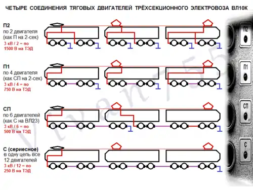 - последовательно-параллельное (СП — ТЭД соединены в две параллельные цепи по четыре ТЭД в каждой, напряжение на зажимах ТЭД 750 В);