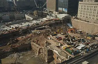 Гигантская стройплощадка на месте Всемирного торгового центра в 2008 году. Железобетонная конструкция поперёк снимка — короб, через который шли поезда