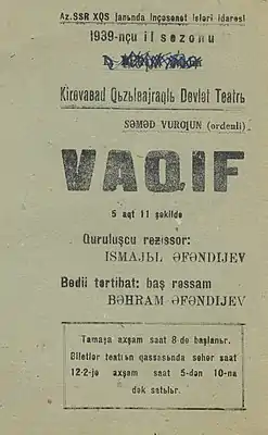 ![]() Афиша спектакля на сцене Кировабадского драматического театра им. Л. Берия. 1939 год | |