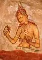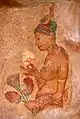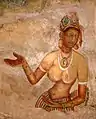 На левом бедре Вишну сидит великолепная богиня Махалакшми. У неё золотистый цвет лица и оленьи глаза. Грудь и шею украшают ожерелья из золота и серебра. Её облик говорит о её благих качествах. Она вечно свежа и юна, с ушей свисают серьги, украшенные драгоценными камнями, а на плечи спадают темные вьющиеся волосы. Открытые части тела покрыты сандаловой пастой, а сама она сияет как божественный цветок. В чудные волосы вплетены цветки мандары, жёлтой кетаки и жасмина. Супруга Шри безупречна на вид, у неё стройный нос и чарующие глаза, окаймленные изящными бровями. Богиня привлекает высокой грудью и полными бедрами. Своим обликом Лакшми напоминает полную Луну. На лотосоподобном лице светится очаровательная улыбка. У неё четыре руки, две из которых украшают большие лотосы. Красоту великолепной Шри подчеркивают драгоценные ожерелья, браслеты и кольца. Господь сияет в своей обители на высших небесах, а Махалакшми никогда его не покидает. По обе стороны от Господа на лотосе находятся очаровательные Дхарани (богиня земли, то есть Бху) и Нила (Наппинней). Рядом на концах лепестков по восьми направлениям небесные девушки, — Шакти, Вимала, Уткаршини, Джнана, Крия, Йога, а также Прахви, Сатья и Ишана, — восемь сил Высшей души. Они отмечены благоприятными знаками, сияют лунным блеском и восхищают своего господина Ачьюту.