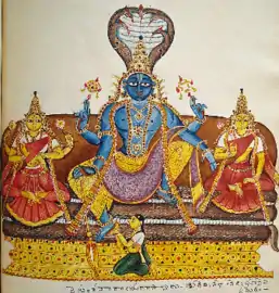 (Ты) отдыхающий на змее, которого преданные называют Шешей из-за различных форм, которые он принимает, служа тебе как жилище, ложе, трон, сандалии, одежды, подушка и зонт от солнца и дождя.