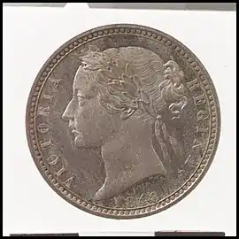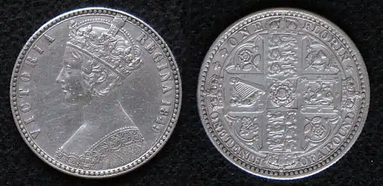 Британский флорин (1849). Аверс (слева) выполнен У. Вайоном