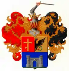 Щит полурассечён-пересечён. В первой, червлёной части, длинный золотой, с полуперекладиною внизу костыльный крест. Во второй, золотой части, выходящий из правого бока чёрный, с червлёными глазами, клювом, языком и когтями орёл, держащий зелёный лавровый венок. В третьей, лазоревой части, серебряные с двумя круглыми башнями ворота.