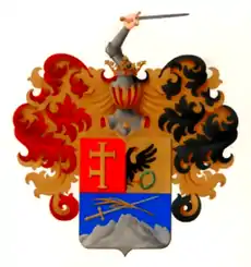 Щит увенчан дворянскими шлемом и короною. Нашлемник: в серебряных латах рука, держащая серебряный же с золотою рукоятью меч. Намёт: справа — червлёный, с золотом, слева — чёрный, с золотом[3].