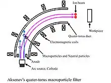 В силу того, что катод-мишень испытывает активную бомбардировку ионами, вырываемыми с её поверхности, то в общем случае плазменный поток из катодно-дугового источника содержит не только отдельные атомы или молекулы, но и достаточно крупные их кластеры (так называемые макрочастицы), которые в некоторых случаях без какой-либо фильтрации мешают его эффективному использованию. Существует много разнообразных конструкций фильтров (сепараторов) макрочастиц, наиболее изученной из которых является конструкция с криволинейным плазмоводом (каналом), основанная на работе И. И. Аксёнова (с соавторами), опубликованной в 70-х годах XX века. Она представляет собой четверть тороидального канала, где с помощью принципов плазменной (ионной) оптики плазменный поток разворачивается под углом 90° к источнику плазмы, в результате чего нейтральные или слабоионизированные частицы и макрочастицы оседают на его стенках, не достигая обрабатываемой детали.