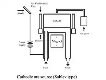 Катодно-дуговой источник конструкции Саблева (наиболее распространён на Западе) состоит из короткого массивного катода-мишени цилиндрической формы, изготовленного из электропроводного материала, и открытого с одного (рабочего) конца. Этот катод окружён находящимся под плавающим потенциалом кольцом (экраном), которое служит для защиты нерабочих поверхностей от воздействия дуги. Анодом для данной системы может служить либо стенка вакуумной камеры, либо отдельный анод. Катодные пятна инициируются зажиганием дуги при помощи механического триггера (поджигающего устройства) на открытом конце катода путём кратковременного замыкания цепи между катодом и анодом. После зажигания дуги катодные пятна двигаются самопроизвольно хаотически по открытому концу катода или их движение задаётся посредством внешнего магнитного поля.