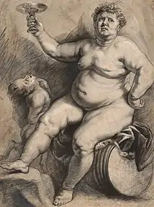 На картине изображён в образе Вакха сидящий на бочке обрюзгший молодой парень с чашей в поднятой руке. Его обнимает женщина-вакханка, наливающая в чашу вино, при этом пролившиеся мимо чаши капли пытается поймать ртом маленький сатир. За спиной у Вакха, запрокинув голову, из амфоры пьёт вино Пан. Справа на переднем плане изображён мочащийся путти.