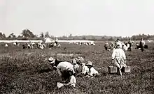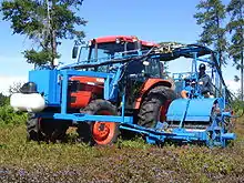Культивирование растений из рода вакциниума началось с клюквы крупноплодной (Vaccinium macrocarpon) в начале XIX века в США и Канаде. В настоящее время в этих странах большие площади заняты под промышленные плантации этого вида. За эти годы выведено более двухсот сортов. Максимальная урожайность клюквенных плантаций — 220 ц/га, средняя — 180 ц/га[23]. Особенность клюквы крупноплодной, выращиваемой в огромных количествах в США и Канаде, состоит в том, что в её плодах имеются воздушные камеры, поэтому это одна из немногих ягод, плавающих на поверхности воды. Это делает сбор ягоды существенно менее трудоёмким по сравнению с обычным ручным сбором: в конце сезона чеки с созревшей ягодой заполняют водой и пускают специальные комбайны, которые взбивают эту воду, при этом зрелые ягоды отрываются. После этого сгоняют все ягоды к одному краю чека, где её — чистую и промытую — вычерпывают для дальнейшей переработки[24].