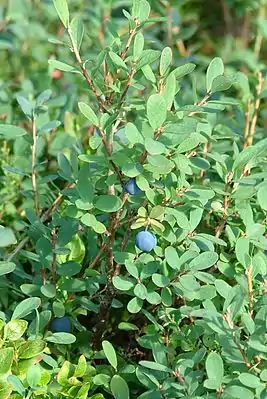 - Vaccinium myrtillus L. (1753) — Черника, или Черника обыкновенная, или Черника миртолистная. Листопадный кустарничек высотой до 60 см с зелёным стеблем, который древеснеет лишь снизу, одиночными цветками с пятизубчатым венчиком белой, розовой или красной окраски и съедобными плодами иссиня-чёрного цвета; растение широко распространено как в Евразии, так и в Северной Америке; растёт в хвойных и смешанных лесах, в тундре и высокогорьях. Ягоды собирают для использования в сыром и переработанном виде. Ягоды и листья используются в медицине[9][10][14].