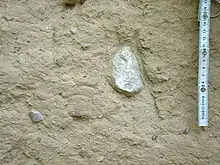 Валунный суглинок представляет собой смесь суглинистого вещества (главным образом глинистые частицы гидрослюды и хлорита с примесью каолинита и монтмориллонита, а также различные алевриты, преимущественно обломочного происхождения), и песка с беспорядочно распределёнными в ней грубыми обломками и валунами различных горных пород и разного размера (нередко отшлифованными с одной стороны и покрытыми ледниковыми шрамами[5])[6][7][8].