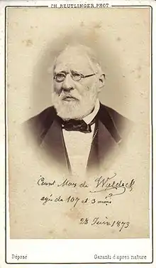 Последняя персональная выставка литографий и картин Вальдека прошла в Париже в 1866 г., когда по собственному утверждению, ему было 100 лет. По официальным сведениям, он был сбит экипажем на Елисейских полях в возрасте 109 лет 45 дней. (М. Стингл утверждал, что художник засмотрелся на хорошенькую парижанку.)