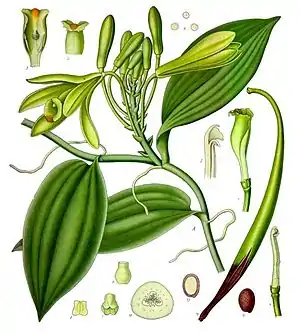 ![]() Vanilla planifolia. Ботаническая иллюстрация из книги Köhler’s Medizinal-Pflanzen, 1887 | ||||||||||||