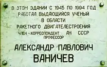 Мемориальная доска на здании, где работал Ваничев Александр Павлович.