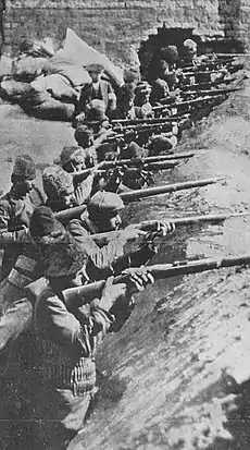 ![]() Армянские солдаты на линии обороны у крепостных стен Вана, май 1915 года | |||