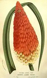 Ботанические иллюстрации из журнала Flore des serres et des Jardins de l'Europe: Aristolochia goldieana (слева), Heliconia bihai и Phenakospermum guyannense [syn. Urania guyanensis] (в центре), Kniphofia uvaria (справа) | ||||||||||
