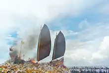 Кульминацией праздничной недели становится сожжение лодки, которая символически заполнена богатой добычей ван-е — т.е. болезнями, которые могли бы навредить людям. Самый масштабный и красочный фестиваль проходит на Тайване в храме Дунлун (городе Дунган (Тайвань))[6]. Лодки могут быть, как чисто декоративными, сделанными из бумаги, так и построенными из дерева, в натуральную величину (вплоть до 100 метров), и практически полностью функциональными[3].