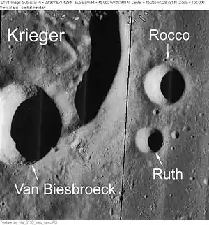 ![]() Снимок c борта Аполлона-15. Кратер Ван Бисбрук перекрывает южную часть кратера Кригер (нижняя часть снимка). | |