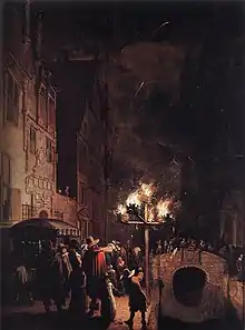 На этой ночной сцене представлены готическое здание XVI века, выходящее на старейший канал в Делфте. Прохожие удивленно смотрят на факелы, которые создавались, вероятно, из бочек, наполненных смолой. Сюжет не объясняется художником. Вероятно, подобное празднование в городе было устроено в честь подписания мирного договора между Нидерландами и Испанией в 1648 году в Мюнстере.