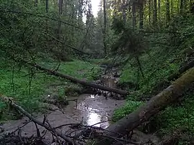 Верховья оврага заняты еловыми лесами с участием ольхи серой и березы влажнотравными с кочедыжником женским, живучкой ползучей, дудником лесным, вербейниками обыкновенным и монетчатым, скердой болотной, щучкой дернистой, звездчаткой дубравной, бодяком разнолистным.