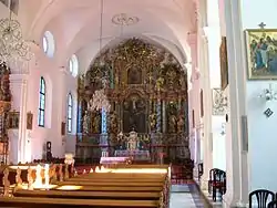 Архитектурно собор представляет собор раннебарочную однонефную церковь с шестью боковыми капеллами. Внешний облик храма довольно скромен, однако интерьер храма контрастирует с ним своим богатым декором. Особо выделяется двухуровневый вычурно декорированный главный алтарь, созданный в 1737 году. В центре нижнего уровня алтарного образа — живописное изображение сцены Вознесения Богоматери, по левую и правую стороны — статуи святых апостолов Петра и Павла, Игнатия Лойолы, Франциска Ксаверия, Иоанна Непомуцкого и святого Доната. В центре верхнего уровня — образ святых Иоакима и Анны и статуи евангелистов.