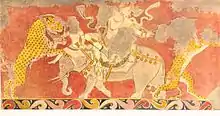 Варахшинский дворец расположен непосредственно у южной крепостной стены городища к западу от цитадели. Здание дворца возникло, как показали раскопки, в V веке н. э. и просуществовало вплоть до конца VIII или начала IX века. В структуре дворцового здания главным были три расположенных в ряд крупных парадных зала — Восточный, Красный и Западный. Стены парадных залов были богато украшены живописными сценами различного содержания: например, изображен царский приём, возглавляемый самим царём, восседающим на троне. В Красном зале стены были расписаны сценами охоты на хищных и фантастических зверей. Наличие стенных росписей установлено и в Западном зале.[2]