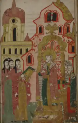 ![]() Епископ Суздальский Варлаам передает царю Ивану Васильевичу житие и чудеса преподобной Евфросинии | ||