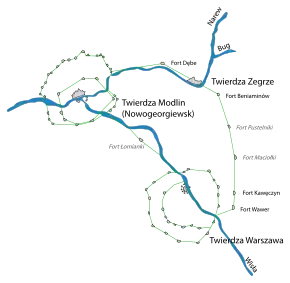 - в 1-й линии (Привислинские крепости), на реке Висла, были построены крепости: Новогеоргиевск (преобразованный из Модлина), Варшавская Александровская цитадель и Ивангород;