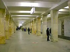 Путевые стены были отделаны белой с голубым отливом керамической плиткой, а также коваными изображениями Варшавы (авторы Х. М. Рысин, А. Я. Лапинь, Д. Я. Бодниек). Четырёхугольные, расширяющиеся кверху колонны были облицованы серо-жёлтым мрамором с голубыми вкраплениями. Пол был покрыт серым гранитом. Светильники были скрыты в ребристом кессонированном потолке. В 2019 году в рамках работ по реконструкции Каховской линии и её будущему включению в состав Большой кольцевой линии началась работа по замене всей отделки станции.