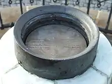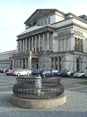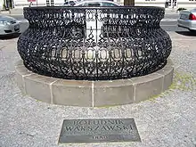 В 1872 году[1] (ранее был ошибочно указан 1800 год[2]) на Театральной площади напротив дворца Яблоновских, тогдашней резиденции городских властей, была установлена мраморная колонна. В верхней части колонны находится металлическая табличка, защищённая стеклом, на которой были написаны географические координаты точки измерения, её высота над уровнем Балтийского моря и ноль Вислы; в центре на таблице выгравированы пересекающиеся под прямым углом линии параллели и меридиана, проходящего через шпиль башни ратуши, служившей базовой точки триангуляции в Варшаве.