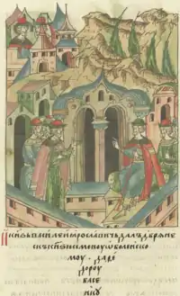 ![]() Лицевой летописный свод: «В ту же зиму скончался князь Василий Ярославич в оковах» | |