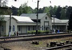 | Железнодорожный вокзал (здание построено в 1936 году) | Остановка «Лесокомбинат» | Остановка «улица Ленина» | Крестовоздвиженская церковь |