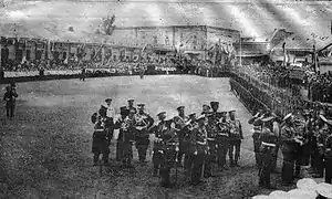 «Император Николай II в сопровождении свиты принимает парад потешных на площади г. Овруча. Представители города преподносят икону Николаю II, население преподносит императору хлеб-соль. Николай II обходит учащихся гимназий. Крестный ход во главе с духовенством. Молебен на площади города.»[10]