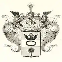 Описание герба: Выдержка из Общего гербовника В большом щите посредине на серебреной полосе находится лавровый натурального цвета венок с двумя на нём золотыми пчёлами, а в нижней части в золотом поле изображено дерево груша с плодами. К сему гербу по случаю пожалования Действительного Тайного Советника, Сенатора и Кавалера Алексея Ивановича Васильева в Графское достоинство Всероссийской Империи, прибавлена золотая вершина, на которой виден вылетающий до половины чёрный двуглавый орёл коронованный с распростёртыми крыльями. На большом щите наложена Графам свойственная корона с тремя шлемами, из коих средний увенчан Графскою короною с страусовыми перьями; крайние же два с правой стороны дворянскою, а с левой Баронскою коронами и с одним на каждой чёрным орлиным крылом. Намёт на щите зелёный, подложенный золотом. |