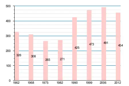 | 1962 | 1968 | 1975 | 1982 | 1990 | 1999 | 2005 | 2006 | 2008 | 2010 | 2011 | 2012 |