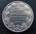 | Реверс | Надпись в 7 строк "DEN / SIEGERN / BEI / WATERLOO / GEWIDMET / AM 18 JUNI / 1865" (Победителям при Ватерлоо посвящается 18 июня 1865) в венке из двух лавровых ветвей | ||