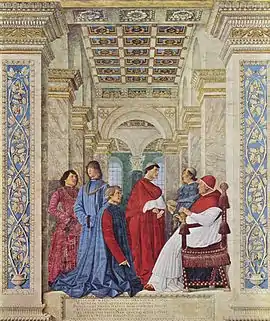 Первоначально залы библиотеки папы Николая V были украшены фресками Доменико Гирландайо, Мелоццо да Форли и Антониаццо Романо. С расширением фондов библиотека получила новое здание, построенное в 1587 году Доменико Фонтана. Из-за нехватки места двухэтажное здание было построено поперёк двора Бельведера, таким образом разрушив архитектурную композицию позднего Ренессанса работы Браманте.