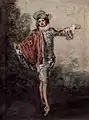 Мало кто вообще писал актёров. Тем более никто не решался показать актёра в полном бездействии. Для самого Ватто это было шагом отважным: написать фигуру в самой середине холста, заполнив большую его часть широким, совершенно скрывающим тело комедианта балахоном, а в глубине изобразить лица других актёров, весельем и оживлением резко контрастирующие с почти неподвижным лицом героя. <…> Лишённый жестов и мимики, симметрично и плоско вписанный в холст, он спокойно существует во времени, словно навсегда остановившемся для него. Ему чуждо все, что скоротечно и преходяще. Суета за его спиной — в движениях актёров. Смех и веселье зрителей — перед ним. А он остаётся неизменно недвижным, со смешным и трогательным укором в круглых, ласковых и умных глазах…»