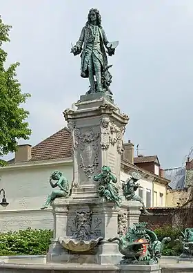 Недвижна статуя из тёмной с изумрудно-зелёными потеками бронзы — спокойно смотрит на скучную площадь изящно и чуть небрежно одетый господин, похожий не столько на самого Ватто, сколько на персонажи созданных им галантных празднеств. Названия его картин, высеченные золотом на постаменте, будто напоминают зрителю, что художник не существует вне своих созданий»
