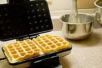 - Американские вафли — являются разновидностью бельгийских (см.). Популярность в Америке завоевали в 1960-х годах, куда их привезли бельгийские кондитеры. Имеют большой размер и круглую форму. По консистенции и способам сервировки ничем не отличаются от бельгийских, но вместо дрожжей и сливочного масла в них обычно добавляют разрыхлители и маргарин[3].