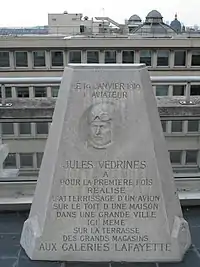 - В 1921 году на террасе магазина «Галерея Лафайет» был установлен мемориальный обелиск в честь Жюля Ведрина, совершившего первую посадку самолета на крышу здания.
