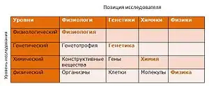 - понятия должно быть амбивалентными, то есть иметь природу (принадлежать к уровню организации, структуры, функционирования, управления) и, в то же время, быть объектом строго специализированного вида исследования (или управления), по названию не совпадающего с уровнем организации;