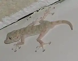 Эти гекконы имеют тонкие лапы, гладкие у основания пальцев. Каждый из пальцев заканчивается сильно расширенной присоской-пластинкой с веерообразными пальцами и щёточками. Способность таких пластинок удерживать на месте тело животного чрезвычайно высока. Замечено, что после длительного прыжка животное, будто приклеенное, остаётся там, куда оно попало, будь то потолок комнаты, оконное стекло или полированная дверца шкафа.